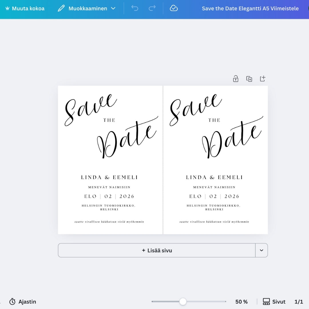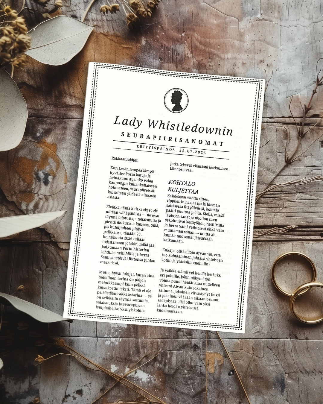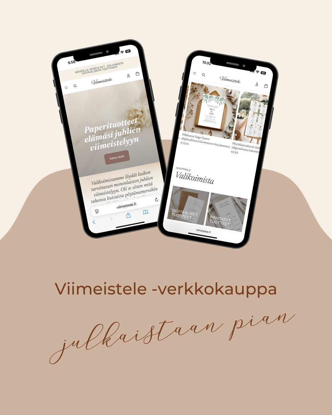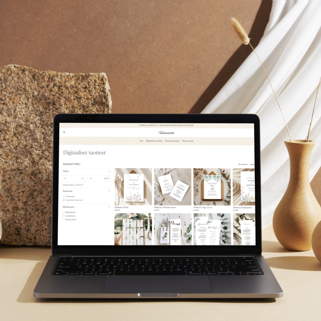 Tarjoamme digitaalisia tuotteita, joita voit muokata juuri omien toiveidesi mukaan helposti, nopeasti ja edullisesti. Haluamme tehdä juhlien viimeistelystä paitsi kaunista, myös vaivatonta. Siksi voit valita, haluatko tulostaa tuotteet itse vai tilata ne kotiin painettuina – kaikki lähtee meiltä rakkaudella pakattuna.