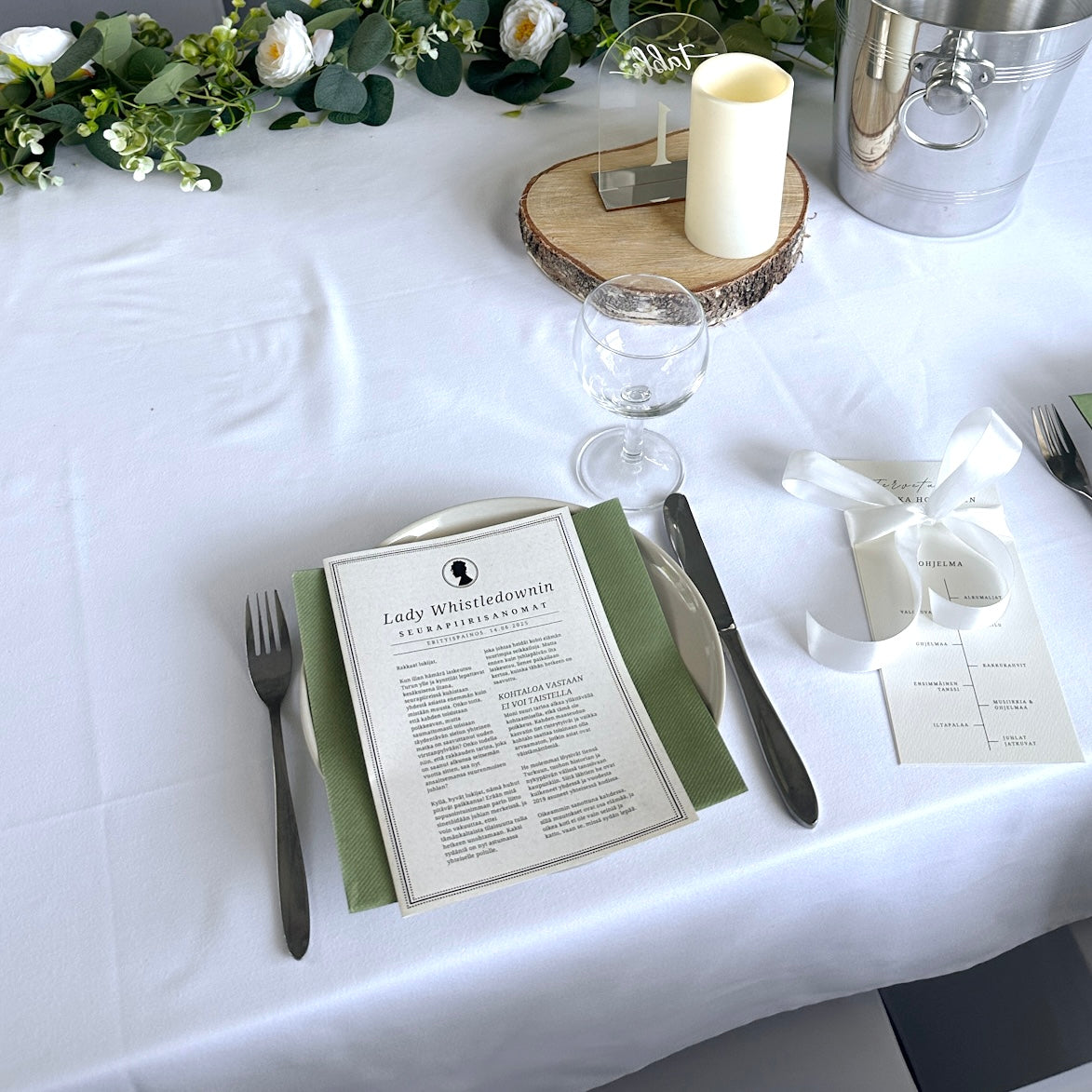 Valikoimastamme löydät kaiken tarvittavan monenlaisten juhlien viimeistelyyn. Oli se sitten mitä tahansa kutsuista pöytänumeroihin tai häiden salatehtäviin.